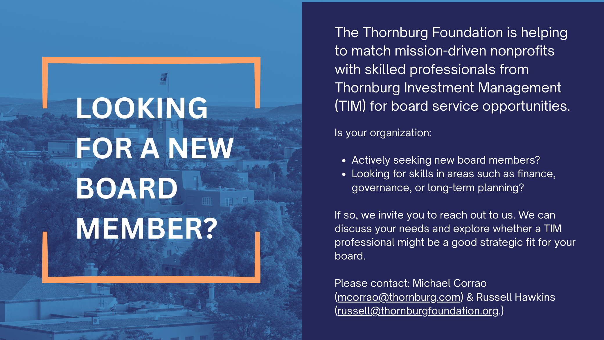 The Thornburg Foundation is helping to match mission-driven nonprofits with skilled professionals from Thornburg Investment Management (TIM) for board service opportunities.